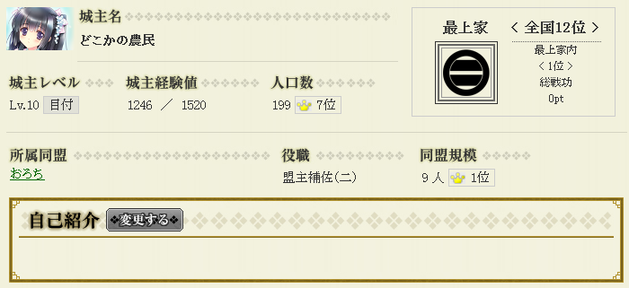さて、タイトルどおり刷新を迎えてW41+42として開始して今日で3日目になりました。 前期は後半からほとんどINできず、万全とはいえない状態での刷新を迎えたわけですが、何とか周りに置いてかれないように頑張っていきたいと思います。 さて、今期の私の現在の状態はといいますと…… ↑12/20時点のプロフ 1期目は少数人数でのんびりやっていましたが、2期目ではさすがに厳しいと思ったところ奇特な同盟さんから合併の打診がありまして合併することとなりました。今期もまったりいけるといいですね。 内政面では何とかレベル10になり所領2つ確保をしました。 現在の生産量が約400オーバーとなかなかの滑り出しです。 本領 所領1 所領2 現在、生産力を高めよう!その3を目指して内政中の本領と、ほぼ開発終了の仮所領の所領1、そしてスキル発動に掛けた博打に勝利してゲットした☆8-33342です。 剣豪自体は部隊4人全員がランク3で、レベル20にまで育っているのはそのうちの二人だけという感じでしたが、4人中3人が新陰流の追加に成功しており、計算上はスキルがたくさん発動すれば何とか勝利できると計算して、いい立地の33342を確保するために博打ではありましたがものはためしにとやってみてよかったです。 ちなみにスキル無発動でも勝利するには、私の剣豪ですと足軽を約5000~6000程度無いといけないので、2つ目以降の33342を狙う前に量産しておきたいですね。 そんなこんなな3日目ですが、最初の合戦の1月1日までなんとか内政を形にしていきたいですね。 戦国IXA(イクサ) ブログランキングへ |