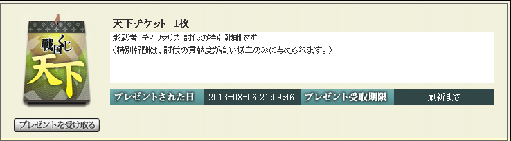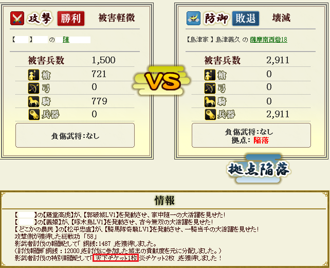 これも、国内筆頭の方が国内上位のアクティブの方に声をかけて人を集めてくれたおかげです。 当同盟の筆頭プレイヤーさんにも声がかかり、そこから同盟メンバー4人全員が影武者に参加しました。 普段はなかなか出来ない同盟間の協力ですが、東西戦を前に共同戦線を張ることが出来てよかったと思います。 参加された方、お疲れ様でした! 討伐時の合戦報告書 銅銭12000の影武者の討伐だったため、天下チケットは上位3名のみの狭い枠でした。 他の参加者さんはそれぞれかなりの損害を受けつつ戦ったものの、途中で出城に攻撃を受けるなど、影武者に集中できず、影武者攻撃に集中できた当同盟のメンバーが3つのチケットを独占する事態となってしまいました。 ちなみに、私も無事天下チケットをゲットできました! 3枚集めて天上くじを引くのが今から楽しみです^^ 戦国IXA(イクサ) ブログランキングへ |