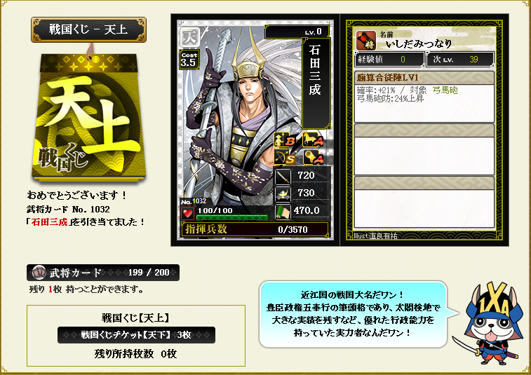 半年間の長い間、お疲れさまでした。 と言うわけで本日のメンテにて刷新報酬が配られました。 早速天上・天下・炎くじを引いている方や、夜に同盟の仲間と一緒に引いてみたり、来期まで持ち越しの方もいらっしゃるかと思います。 私はと言いますと、農民ながらちょこちょこ総合を稼いだおかげで天上くじを引く権利を無事ゲットしました。 で、早速引いてみました! ドーン! なんと天石田様が光臨! 今までIXAをしてきて天上くじから初めて天を引きました! と言うわけで来期の35+36鯖で天石田様で引きこもっている農民がいたらもしかすると私です。 そして残すところ合戦は第二回東西戦だけとなりました。 組み合わせは当ブログで立てた予想とは「まったく」違っちゃいまして、 1組西軍:武田・織田・伊達 vs 1組東軍:豊臣・上杉・北条 2組西軍:長宗我部・島津・毛利 vs 2組東軍:最上・足利・徳川 戦功を見る限りは1組は東軍が2組は西軍がそれぞれ有利な感じでしょうか。 ないても笑っても2期はこの東西戦で終了するので、悔いのないよう頑張っていきましょう。 繰り返しにはなりますが、半年間お疲れさまでした。 来期もよろしくお願いします。 戦国IXA(イクサ) ブログランキングへ |